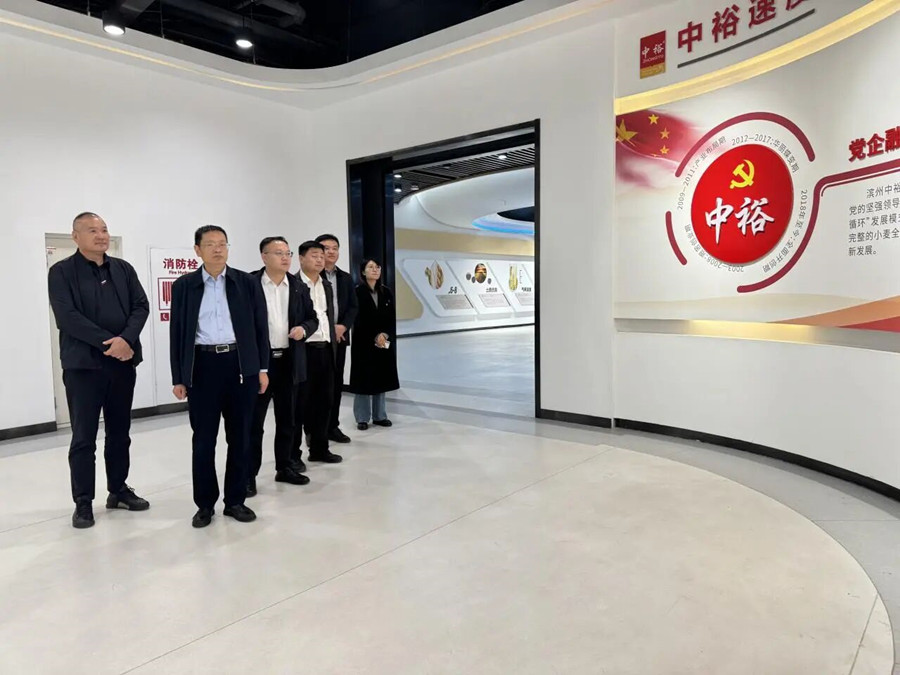 在中裕三产融合发展示范园,考察团一行通过实地查看、听取介绍等方式,详细了解了项目规划建设、产品研发及“三产融合、绿色循环”产业链条以及节能降碳方面取得的成效等情况。参观了黄河三角洲小麦产业馆、物流配送中心、央厨生产车间、养鸡场、生猪加工车间、麦便利实体店等。了解中裕食品如何从田间到餐桌,打造贯穿一二三产业的小麦加工全产业链。滨州中裕食品有限公司副总经理尹广利重点介绍了一二三产业融合发展的“中裕模式”,以小麦种植养殖为基础,坚持产业“抓深、抓细”,对小麦、生猪,鸡等进行深度开发、综合利用,最大限度提升资源利用率,提升产品丰富度和优质化。