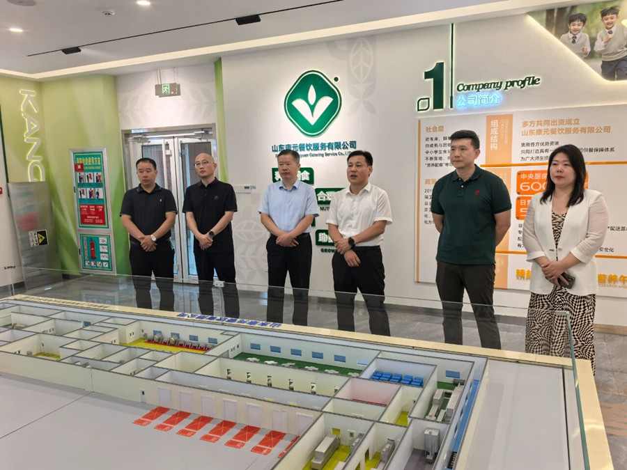 考察团一行走进康元公司生产车间,详细察看了食材清洗、切配、烹饪、分装及冷链配送等环节,了解了康元公司智慧化管理系统的运行情况,对公司在原料采购、加工制作、食品安全检测等方面的规范化管理给予高度评价,对公司在订单处理、库存管理、营养配餐等方面的信息化水平表示赞赏。随后,在座谈会上,郑宁介绍了康元公司发展情况及业务布局。康元公司自成立以来,始终坚持“安全第一、营养均衡、服务至上”的理念,已建立覆盖济宁市任城区、经开区、太白湖区、高新区及曲阜、嘉祥、兖州、鱼台、金乡等县市区的服务网络。
