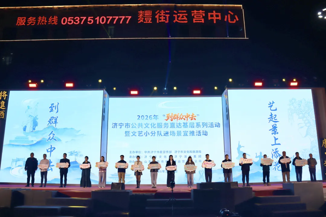 3月22日晚,由中共济宁市委宣传部、济宁市文化和旅游局主办,济宁市文化馆、济宁演艺集团承办的2026年“到群众中去”济宁市公共文化服务直达基层系列活动暨文艺小分队进场景宣推活动启动仪式在国投·麷街正式举行。